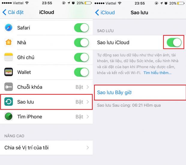 Nếu muốn sao lưu dữ liệu lên iCloud, bạn hãy vào Cài đặt > iCloud > Sao lưu và chuyển tùy chọn sao lưu iCloud sang chế độ Bật, sau đó chạm tiếp vào nút Sao lưu bây giờ nằm ngay bên dưới. Lưu ý là iCloud phải còn dung lượng trống thì việc sao lưu dữ liệu mới thực hiện được.