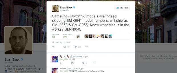 “Người rò rỉ” – Evan Blass (@evleaks) mới đây đã chia sẻ trên bài đăng Twitter của mình cho hay Galaxy S8 sắp tới sẽ có tên model là SM-G950 và SM-G955. Thú vị hơn, Blass cũng cho biết Samsung đang chuẩn bị một phiên bản SM-N950, đây là tên mã của dòng Galaxy Note mới bởi trước đó là những model như SM-N930, SM-N920… Có khi nào Samsung sẽ ra mắt S8 cùng với Note 8 không nhỉ?