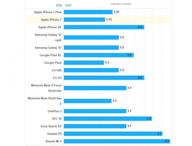 Như các bạn thấy thì Apple iPhone 7, Google Pixel là những smartphone có camera nhanh nhất hiện tại. Bên cạnh đó các điểm số cách biệt không quá lớn thuộc về Samsung Galaxy S7 và LG V20.