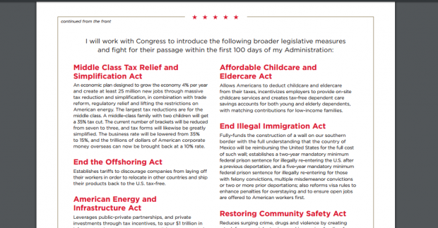 Vừa nhậm chức, ngay lập tức Donald Trump đã thực hiện lời hứa của mình thông qua bản hợp đồng với các cử tri Mỹ đề ra kế hoạch 100 ngày hành động thay đổi nước Mỹ.