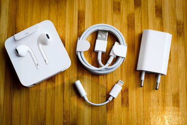 Phụ kiện đi kèm theo máy vẫn bao gồm tai nghe EarPods chân cắm Lightning, giắc chuyển 3,5 mm, cáp Lightning và củ sạc. Tuy nhiên, củ sạc của hàng chính hãng là loại dài với chân tròn, không phải loại vuông chân dẹt như hàng Mỹ hay sạc tam giác với ba chấu của hàng Singapore và Hong Kong.