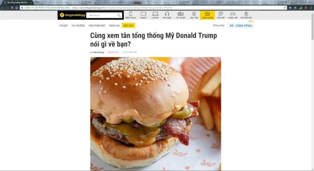 Hình ảnh Donald Trump bị biến thành chiếc bánh burger trên trang tin TGDD.Caitlin Flynn, một tay bút của tờ báo Hello Giggles, cho rằng tân Tổng thống sẽ không lấy làm vui vẻ khi biết được điều này. Có thể ông sẽ giận dữ và đăng những câu nói không hay trên Twitter cá nhân. Tuy nhiên cô sẽ không chú ý vào điều đó mà cố gắng tập trung vào những thứ tốt đẹp hơn, ví dụ như bánh burger phô mai chẳng hạn. Đó là điều nên làm để vượt qua 4 năm nhiệm kì sắp tới của Donald Trump.