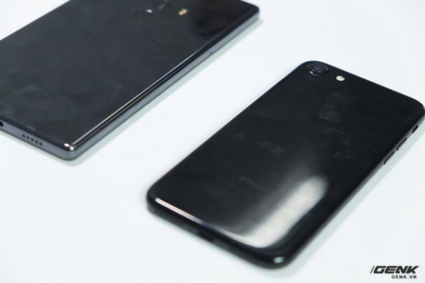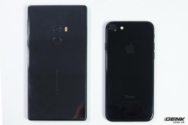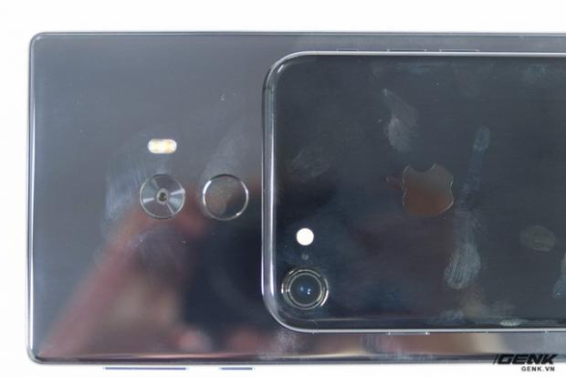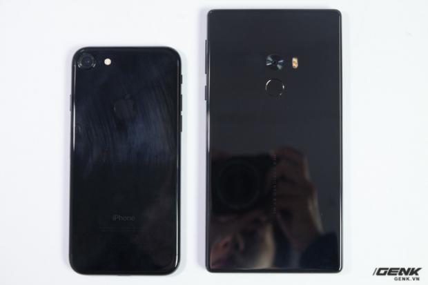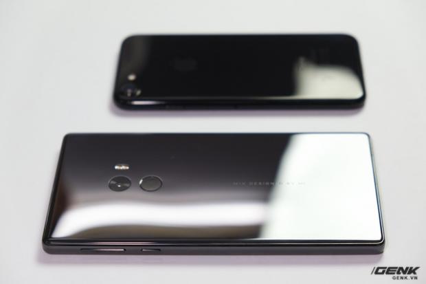 - Lớp vỏ của Mi Mix tuy có bám dấu vân tay, nhưng ít hơn, bớt lộ hơn và dễ lau chùi hơn so với iPhone 7 Jet Black.