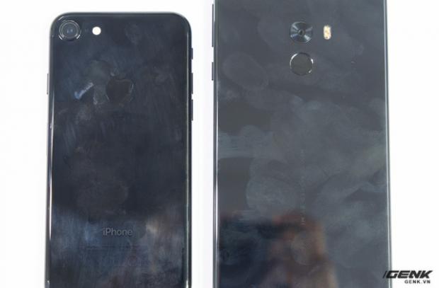 Bẩn là một chuyện, nhưng người dùng iPhone 7 Jet Black sẽ còn phải lo về vấn đề xước. Trong khi đó, vỏ gốm của Mi Mix với độ cứng 8 Mohs chắc chắn sẽ đem lại khả năng chống xước tốt hơn, dù là không tuyệt đối.