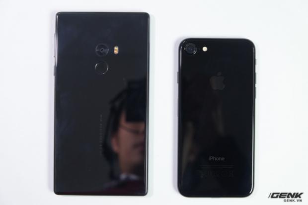 Bề mặt của Mi Mix phản chiếu rất mạnh, thậm chí có thể soi gương. iPhone 7 thì lại không làm được như vậy.