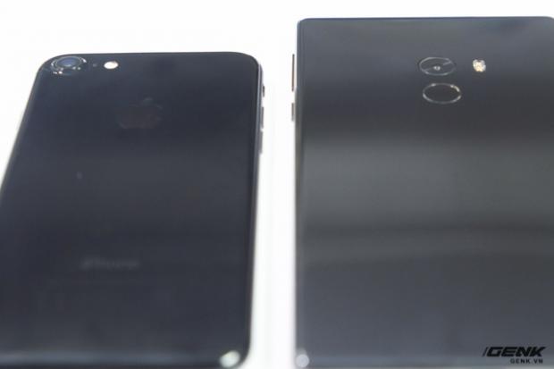 Camera của iPhone 7 lồi lên đôi chút, còn của Mi Mix thì không.