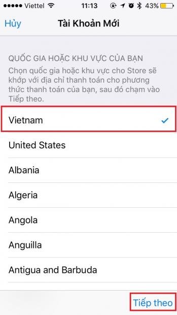 Sau đó hãy tìm quốc gia bạn đang sống, tại đây mình chọn Vietnam > Tiếp theo.