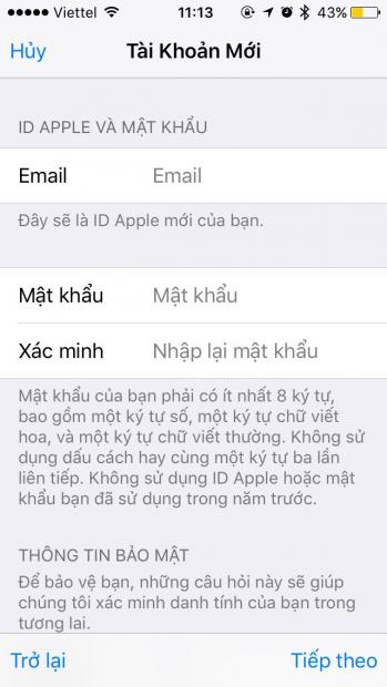 Sau đó làm theo các bước để tạo riêng cho mình một tài khoản Apple ID.