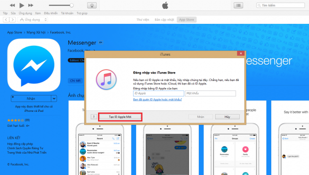 Vào Appstore chọn một ứng dụng miễn phí và tải ứng dụng này về. Ngay lập tức sẽ có một cửa sổ Đăng nhập xuất hiện, tại đây hãy chọn tùy chọn Tạo ID Apple mới.