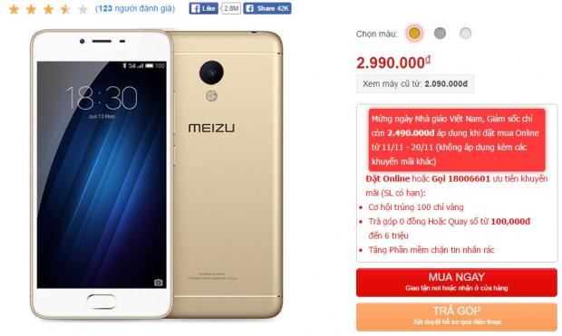 Cụ thể, khi bạn đặt mua online Meizu M3S từ ngày 11-20/11, bạn sẽ được giảm ngay 500 ngàn đồng, tức giá máy giảm từ 2.99 triệu xuống chỉ còn 2.49 triệu đồng, hấp dẫn chưa nào?