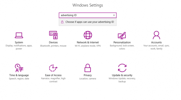 B1: Mở trình Settings từ thanh Start MenuB2: Nhập vào khung tìm kiếm: advertising ID và mở cửa sổ tùy chọn này