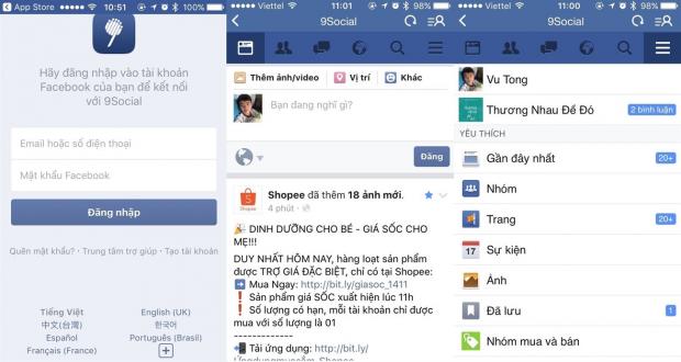 Với 9Social, người dùng có thể thoải mái lướt Facebook và chat Messenger mà không lo lắng về dung lượng bộ nhớ máy cũng như dung lượng 3G. Vì ứng dụng này được xây dựng giống nền tảng Facebook trên trình duyệt điện thoại.