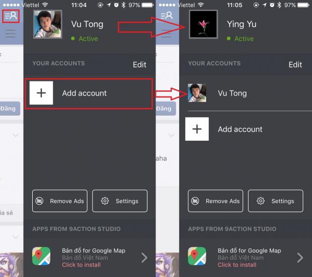 Điểm đặc biệt của 9Social là công cụ này cung cấp cho bạn khả năng quản lí nhiều tài khoản trên một ứng dụng. Nghĩa là khi bấm vào biểu tượng này, bạn có thể thêm từ 2 tài khoản Facebook trở lên và quản lí chúng nhanh hơn.