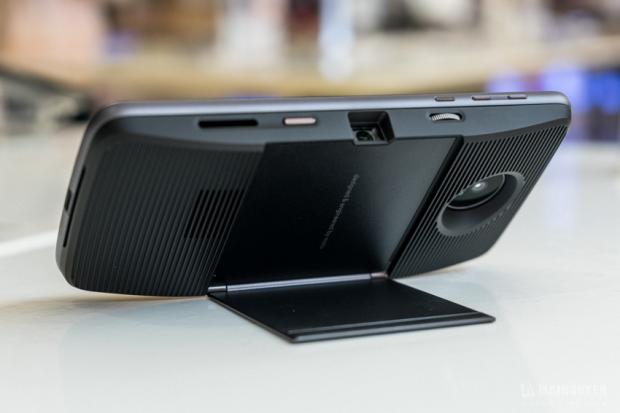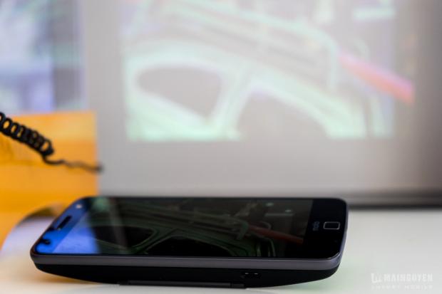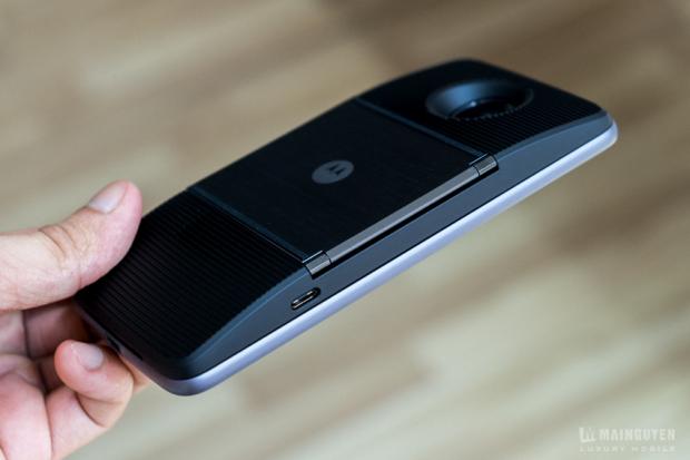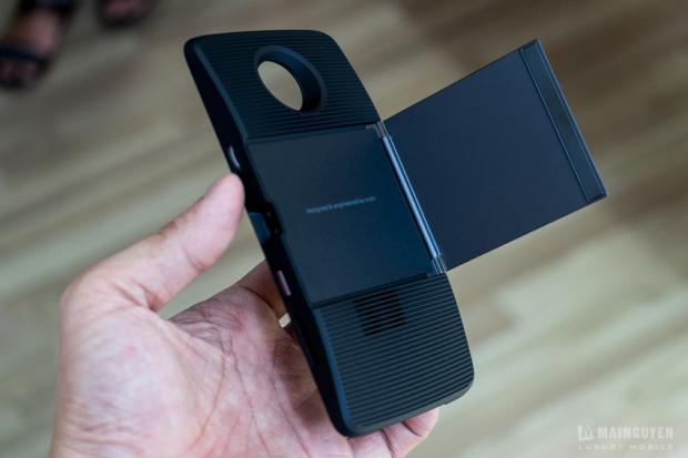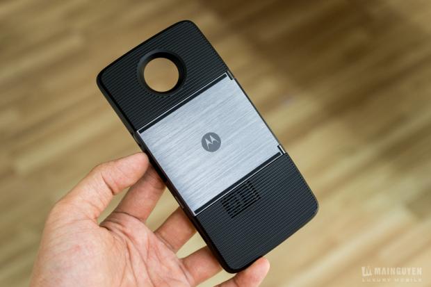Khi kết nối với Moto Z Play thì bạn có thể điều chỉnh hình ảnh qua bất cứ bề mặt nào cũng như độ sáng của màn hình. Có cả tuy chọn bật chế độ im lặng trong suốt thời gian trình chiếu để bạn xem phim, ca nhạc tốt hơn. Insta Share Projector đi kèm với một pin 1100 mAh cho thời gian sử dụng khoảng 1 giờ. Bạn có thể cắm sạc trong khi sử dụng bởi cổng sạc USB-C được đặt bên mặt ngoài thiết bị. Phân thân của Insta Share Projector được hoàn thiện tốt, bản lề làm chân đứng của sản phẩm to bản, dễ tháo lắp và mang đến cảm giác sử dụng đơn giản.