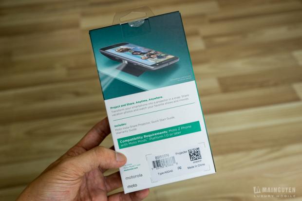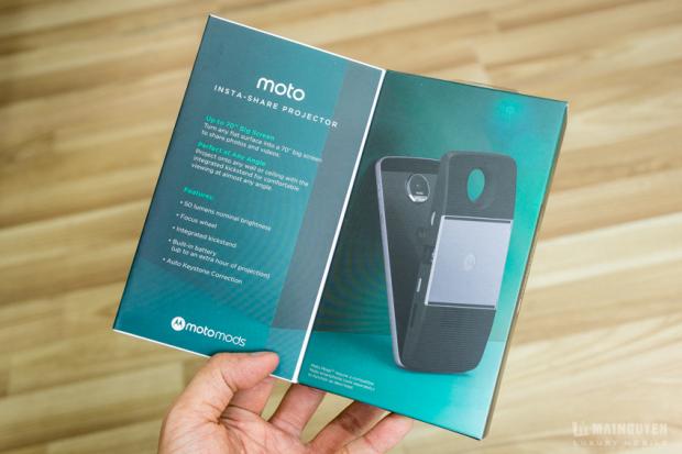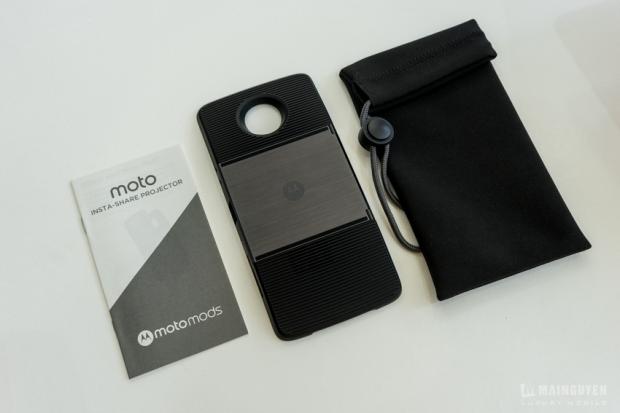 Module máy chiếu Insta Share Projector là món phụ kiện dành cho Moto Z sereis, cho phép bạn có thể chiếu bất cứ một nội dung gì lên một mặt phẳng với độ phân giải WVGA 854x480 pixel (408 ppi). Độ phóng đại của hình ảnh theo thông tin của nhà sản xuất là D/W=1.2, kích thước hình ảnh mà máy chiều cung cấp là vào khoảng 70' theo tỉ lệ 16:9.