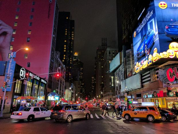 Những hình ảnh chụp thiếu sáng của Google Pixel cũng ấn tượng không kém. HDR+ xử lý để hình ảnh đầy đủ sáng và ít nhiễu nhất có thể. Tuy nhiên độ chi tiết và sắc nét vẫn được giữ lại. Hiệu quả đến từ HDR+ là không phải bàn cãi. Trong bức ảnh có chụp biển quảng cáo dưới đây thì ánh sáng từ tấm biển khi bật HDR+ không bị cháy và chúng ta vẫn nhìn thấy rõ những chủ thể bên dưới.