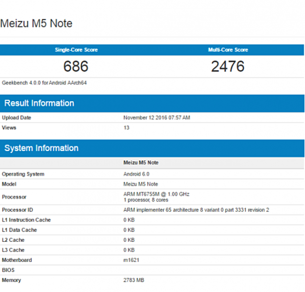Thông số cấu hình Meizu M5 Note trên Geekbench.
