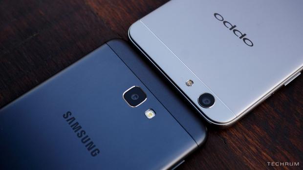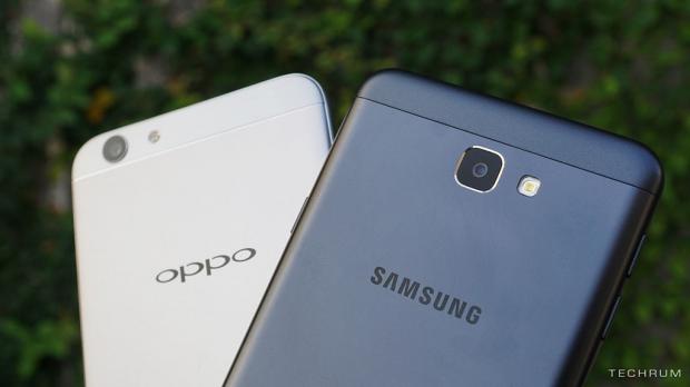 Tuy nhiên logo Samsung và loa thoại không được đẹp khiến cho Galaxy J7 Prime kém liền lạc hơn OPPO F1s ở góc chụp này.