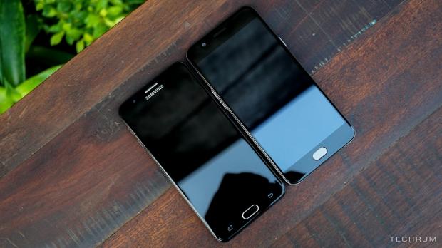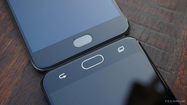 Ở phần cạnh dưới, OPPO F1s tỏ ra đồng màu hơn đối thủ khi hai phím cảm ứng và phím Home làm màu chìm, còn của J7 Prime làm màu bạc khá nổi bật trên tông nền đen.