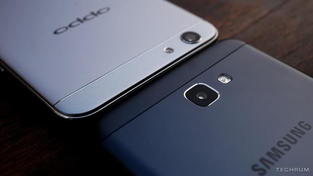 Về mặt lưng, cả hai máy đều không đen hoàn toàn. OPPO F1s là màu đen xám, trong khi Samsung Galaxy J7 Prime là màu đen xanh ánh kim.