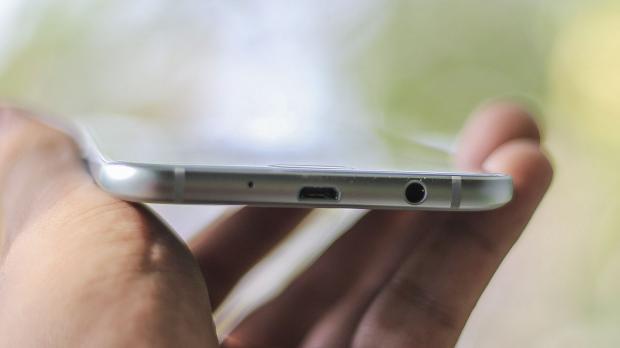 Đáy máy gồm cổng sạc micro-USB, jack tai nghe 3.5 mm và mic thoại.