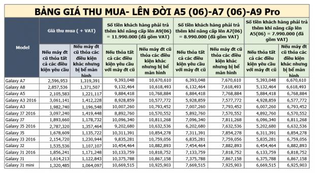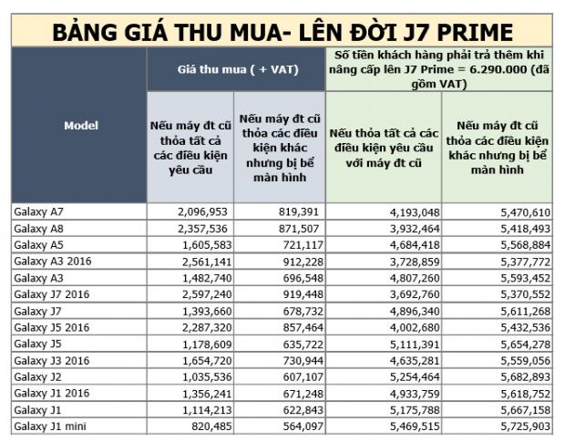 - Giá máy cũ sẽ được kiểm tra và xác nhận bởi nhân viên . Khách hàng sẽ được thông báo số tiền chênh lệch để nâng cấp lên Galaxy A5 2016, A7 2016, A9 Pro hoặc Galaxy J7 Prime