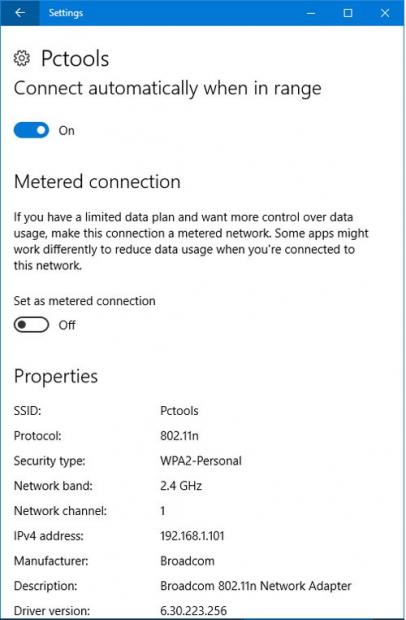 Giờ đây khi nhấn vào biểu tượng mạng mà bạn đang kết nối sẽ thấy Properties, nhấn vào đó sẽ bật lên trang thuộc tính cải tiến đối với kết nối Wi-Fi hiện tại của bạn.