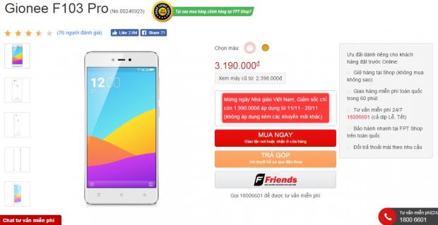 Theo đó nhân dịp ngày Nhà giáo Việt Nam 20/11, mẫu smartphone Gionee F103 Pro đã được giảm giá từ 3.19 triệu xuống còn 1.99 triệu đồng, quá tốt phải không nào. Chú ý là thời gian áp dụng chỉ đến hết ngày 20/11 thôi nhé, vì vậy bạn phải nhanh tay lên.