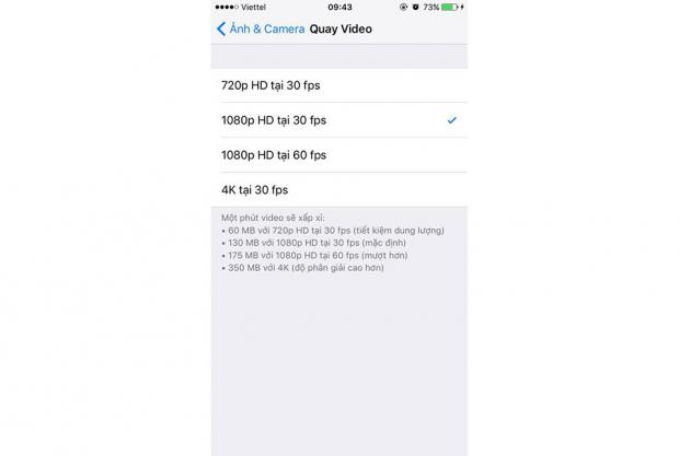 - Lựa chọn độ phân giải khi quay video trên iPhone bạn muốn. Ở đây, iPhone 7 hỗ trợ 4 mức phân giải là 720p 30fps, 1080p 30fps, 1080p 60fps và 4K 30fps. Các chế độ quay sẽ hiển thị bên dưới dung lượng bộ nhớ sử dụng trong 1 phút quay để bạn lựa chọn phù hợp nhất.