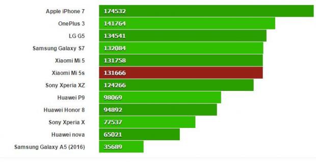 Bảng so sánh hiệu năng bằng phần mềm AnTuTu 6 giữa Xiaomi Mi 5s và các đối thủ khác: