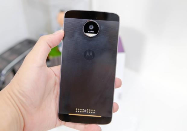 Phía sau là camera 13 megapixel có ống kính khẩu độ f/1.8 hỗ trợ chống rung quang học với chế độ chụp chỉnh tay cho phép phơi sáng 4 giây, máy chụp và lấy nét nhanh ngay cả trong điều kiện thiếu sáng, hình ảnh thể hiện màu sắc trung thực và ít nhiễu. Do máy mỏng nên camera lồi khá nhiều. Camera trước độ phân giải 5 megapixel và có hỗ trợ đèn flash rời. Phía dưới có các chân cắm để gắn phụ kiện nâng cấp phần cứng của dòng Moto Z. Mặt lưng được làm bóng với các đường kẻ ngang đẹp mắt nhưng lại dễ bám vân tay.' />