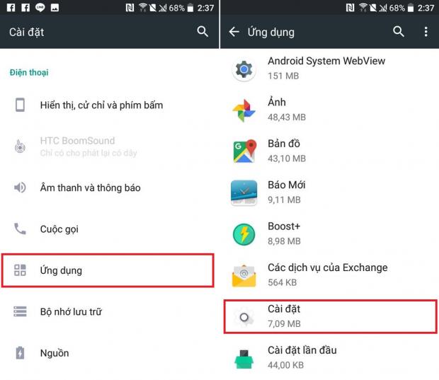 Đầu tiên, các bạn vào Quản lý ứng dụng, tìm và chọn vào mục Cài đặt.