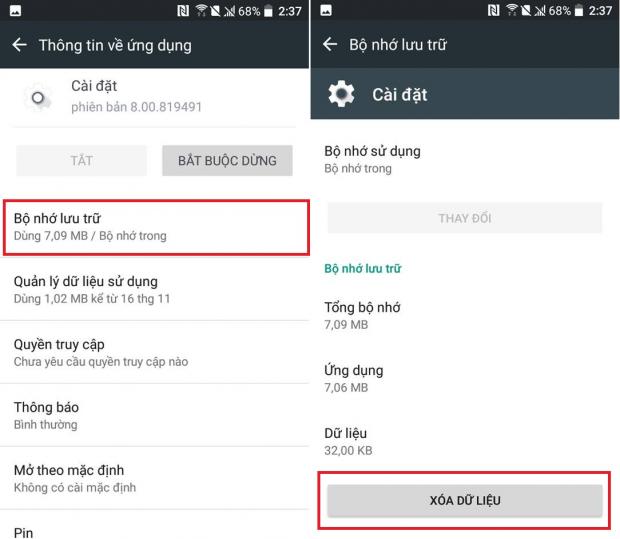 Sau đó, các bạn bấm vào Bộ nhớ lưu trữ và Xoá dữ liệu là xong.