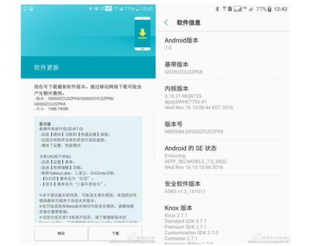 Bản cập nhật cho Galaxy S7, Galaxy S7 Edge có dung lượng 1.4 GB tuy nhiên nó không dùng cho các phiên bản đặc biệt như Galaxy S7 Edge Olympic Games Limited Edition và Galaxy S7 Edge Injustice Edition.