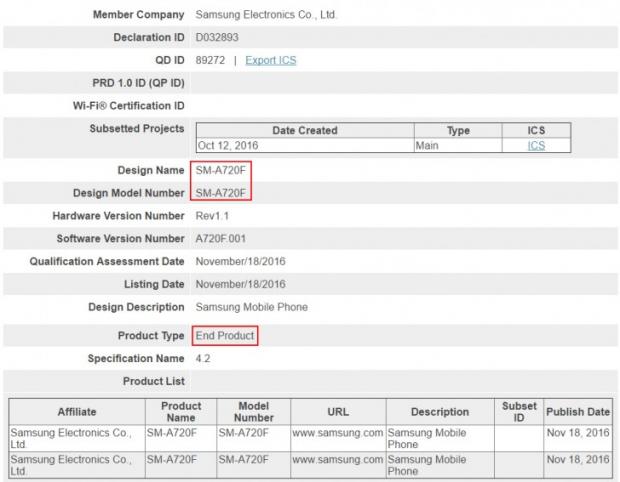 Vẫn như thường lệ, thông tin bị rò rỉ trên đến từ Bluetooth Special Interest Group (SIG) và trong một số tài liệu chính thức. Samsung SM-A720F đã được công bố vào ngày hôm nay. Và trong những chứng nhận này không tiết lộ bất kỳ thông tin kỹ thuật nào của thiết bị. Điều này có nghĩa là ngày ra mắt của chiếc smartphone này không còn xa.