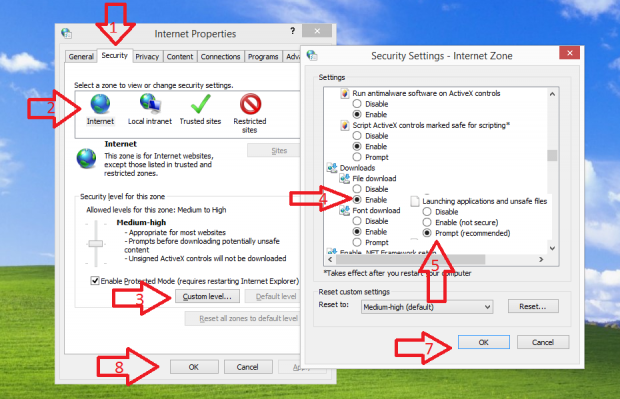 7. Để chắc rằng tải file được cho phép, bạn nhấn tổ hợp phím Windows + R nhập vào inetcpl.cpl để mở Internet Options và chọn tab Security tiếptục nhấn chọn mục Custom level. Trong Security Settings kéo xuống dưới tim mục Dowloads phần File dowload và chọn Enable. Tiếp tục di chuyển xuống một chút nữa để kiểm tra xem mục Launching applications and unsafe files đã được thiết lập là Prompt hay chưa.
