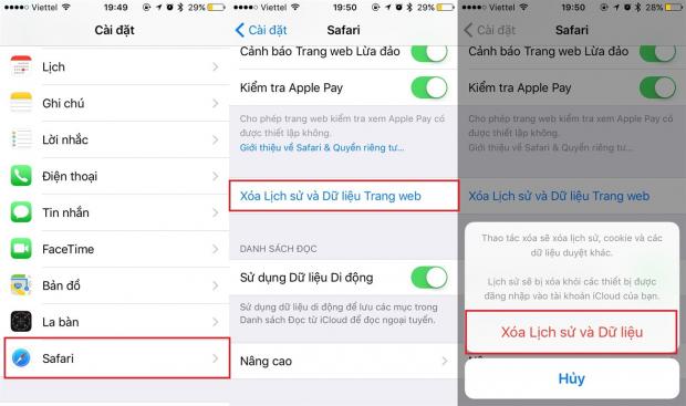 Cookies và cache là dữ liệu được Safari tự động tải và lưu vào hệ thống để giúp bạn duyệt web nhanh hơn ở những lần tiếp theo. Tuy nhiên sau một thời gian sử dụng, lượng dữ liệu lớn sẽ khiến máy của bạn chậm đi một cách đáng kể. Để xóa cache và cookies, mở Cài đặt của Safari rồi chọn Xóa lịch sử và dữ liệu trang Web.