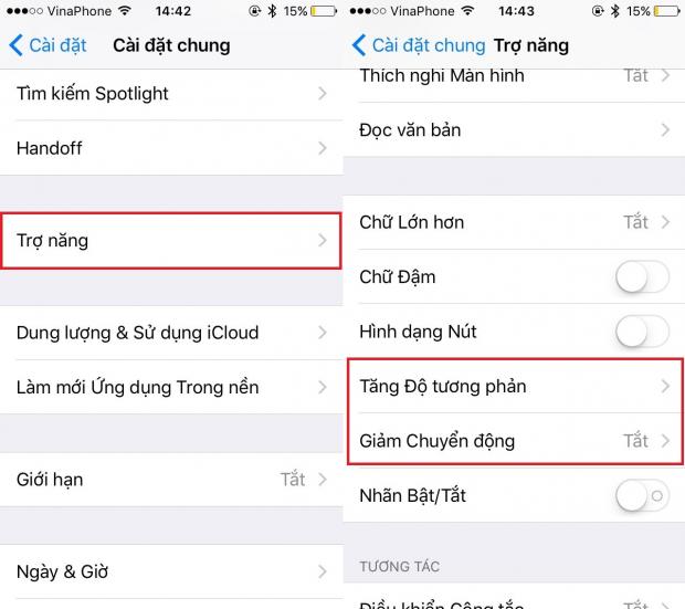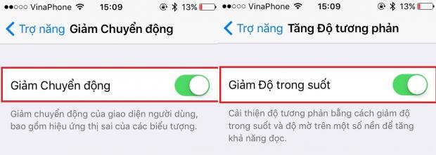 Tại Trợ năng, bạn hãy truy cập vào tùy chọn Tăng Độ tương phản, sau đó gạt nút bật với tùy chọn Giảm độ trong suốt. Tiếp theo để giảm chuyển động trên thiết bị, người dùng có thể truy cập tùy chọn Giảm chuyển động và bật tính năng này lên.