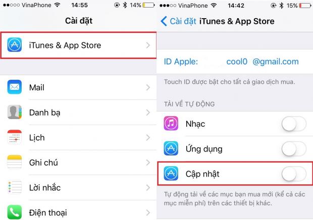 Vì thế nếu không cần thiết lắm phải sử dụng tính năng này, bạn nên tắt nó đi để cải thiện các rắc rối không đáng có. Thay vào đó là cập nhật các ứng dụng bằng biện pháp thủ công. Để tắt chế độ cập nhật tự động, bạn truy cập vào Cài đặt chọn iTunes & App Store sau đó hãy tắt phần Cập nhật đi.
