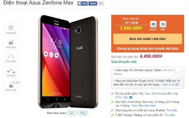 Cụ thể, khi bạn đặt mua online mẫu smartphone ZenFone Max, giá sẽ được giảm từ 4.49 triệu xuống chỉ còn 3.99 triệu đồng, giảm 500 ngàn đồng, cũng lưu ý với các bạn là thời gian khuyến mãi giảm giá này còn hơn 9 ngày nữa nhé.