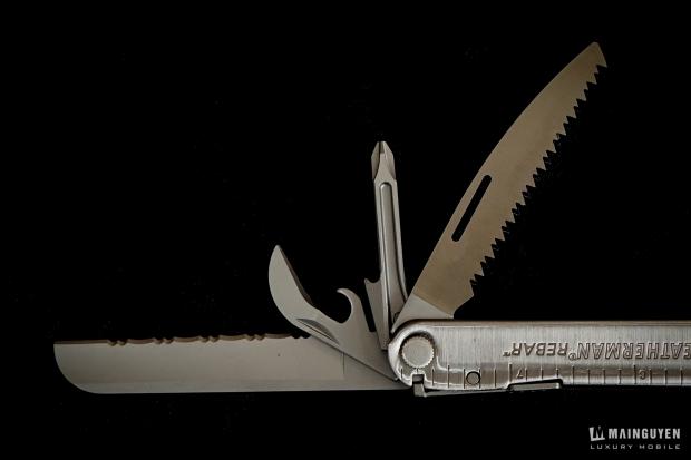 Các công cụ phụ trợ là giống nhau giữa bản SuperTool 300 và Rebar. So với SuperTool 300 thì Rebar chỉ thiếu đầu tua vít nhỏ ở bên cán dùng để mở hộp và tua vít Philips. Thực tế thì mình thấy sự thiếu vắng này không ảnh hưởng quá nhiều trong quá trình sử dụng. Tuy nhiên, sự khác biệt về kích cỡ tổng thể và kích cỡ các công cụ phụ trợ sẽ là thứ dễ nhận biết hơn, khoảng một 7 một 10.
