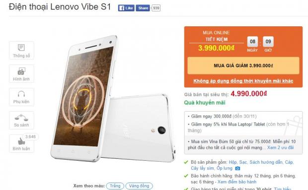 Theo đó, Vibe S1 được hạ giá cực sốc, từ 4.99 triệu đồng xuống còn 3.99 triệu đồng, giảm 1 triệu trong chương trình mua online giá tiết kiệm. Lưu ý là chương trình còn hơn 8 ngày nữa nhé.