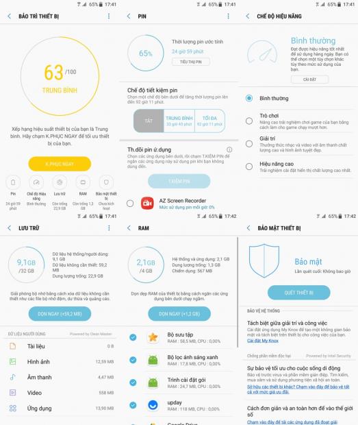 Bảo trì thiết bị là một phần bổ sung trong giao diện Cài đặt trên Android Nougat 7.0 của Galaxy S7 nhằm mang lại tiện ích tốt hơn cho người dùng. Trong phần bảo trì thiết bị, chúng ta sẽ có: Pin, Chế độ hiệu năng, Lưu trữ, RAM và Bảo mật thiết bị. Trong đó Chế độ hiệu năng bao gồm nhiều chế độ khác nhau nhằm mang lại hiệu suất tốt nhất cho người dùng tuỳ theo hoàn cảnh sử dụng.