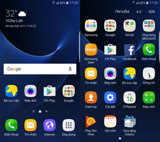 Đầu tiên, đập vào mắt chính là bộ icon, trên Galaxy S7, giao diện Grace UX Android 7.0 sở hữu bộ icon đẹp hơn, tinh tế và nhẹ nhàng hơn với các góc cạnh được bo tròn đều. Ngoài ra, trong khu vực chứa ứng dụng (app drawer), bạn có thể tìm thấy thanh tìm kiếm nhanh ở phía trên, rất tiện dụng. Còn giao diện trên Android 6 nhìn thô hơn, không hiện đại.