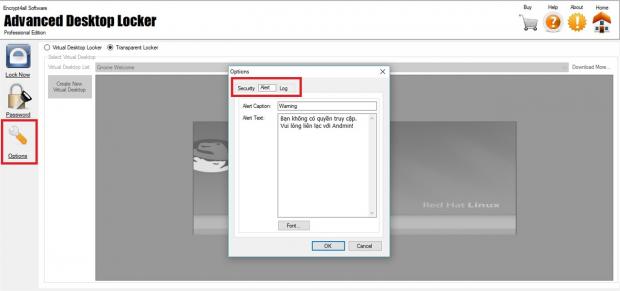 Bước 3: Để tùy chỉnh các thông báo hiển thị khi người khác cố tình mở khóa thiết bị, bạn có thể vào Options > Alert sau đó nhập vào nội dung theo nhu cầu của bạn.