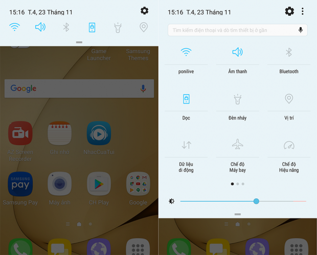 Tiếp theo, vuốt thanh trạng thái xuống lần thứ hai, giao diện QuickSetting sẽ xuất hiện khung tìm kiếm mà không cần tìm đến S-Finder. Các biểu tượng tiện ích cũng được hiển thị đơn giản, rời rạc và cho cảm giác trực quan hơn hẳn. So với Touchwiz 6.0, QuickSetting sẽ không hiển thị tất cả các biểu tượng tiện ích mà được phân trang, người dùng sẽ vuốt sang trái hoặc phải để thấy được các biểu tượng Quick Setting. Điều này giúp QuickSetting bớt rối rắm. Phía dưới là thanh thay đổi độ sáng màn hình. Với giao diện GraceUX, giao diện Quick Setting và các Notification sẽ trông liền mạch hơn.