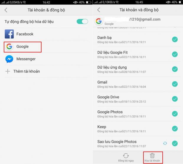 Vào Cài đặt > Tài khoản > chọn tài khoản Google muốn xóa sao đó chọn xóa tài khoản , sau khi xóa xong bạn vào Cài đặt > Tài khoản > Thêm tài khoản > Google và làm theo các bước hiển thị trên màn hình để đăng nhập tải khoản Google của bạn.