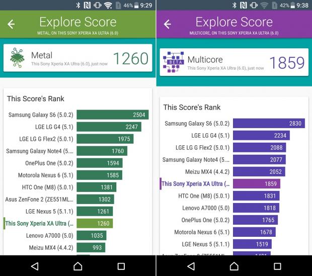 Đầu tiên chúng ta chúng ta sẽ do tốc độ xử lý của CPU trên chiếc Xperia XA Ultra bằng phần mềm Vellamo. Kết quả do được với tốc độ xử lý đơn nhân là 1.260 và đa nhân là 1.859. Mặc dù có tới 8 nhân xử lý, xung nhịp 2.0 GHz, nhưng kết quả mà máy có được khá khiêm tốn hơn những gì mà chúng ta mong đợi.
