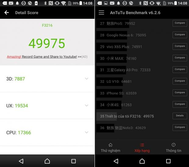 Antutu Benchmark là phần mềm thứ hai được sử dụng, phần mềm này đã quá quen thuộc với người dùng bởi tính chính xác trong việc đánh giá hiệu năng tổng qua của smartphone. Tổng điểm Antutu đạt được là khoảng 49.000 điểm, trong đó điểm 3D, UX, CPU lần lượt là: 7.887, 19.534, 17.366. 3D là mức điểm quan trọng nhất trong phần test này, bởi đây là yếu tố ảnh hưởng trực tiếp đến trải nghiệm giải trí, chơi game của người dùng, với 7.887 điểm 3D thì Xperia XA Ultra có khả năng xử lý đồ họa khá, trội hơn một số dòng máy hiện nay như Galaxy A7 2016, OPPO F1s…