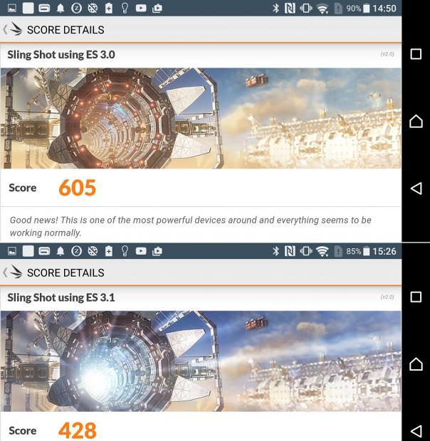 Tiếp tục là phần mền 3D Mark, để giúp người dùng có cái nhìn sâu hơn và chính xác hơn về khả năng xử lý đồ họa của Xperia XA Ultra. Trong 3D Mark, Xperia XA Ultra sẽ lần lượt vượt qua hai bài test nhỏ là SlingShot 3.0 và SlingShot 3.1. Kết quả có được với SlingShot 3.0 là 605 điểm và 428 điểm cho SlingShot 3.1. Với kết quả này, có thể kết luận GPU Mali T860 MP2 tích hợp trên Xperia XA Ultra có hiệu xuất xử lý tốt hơn so với những đời GPU Mali T720 được áp dụng trên các dòng máy trung cấp trước đây.